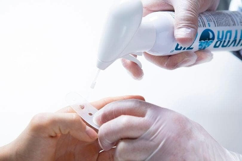 Healthcare professional using Hydrozid to treat a wart. Available in the UK and Ireland from Dunelm Pharma Ltd.